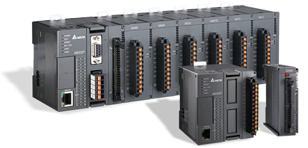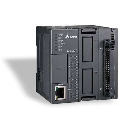 Delta's AS mid-range PLC Series is a high performance multi-purpose controller suitable for a wide variety of applications such as labelling, food packaging and textile machines. Offering enhanced execution speeds up to 40k/step/ms, and supporting upto 32 extension modules, the AS range is powerful, but in a compact form factor. Motion control of up to 8 axes is possible via CANopen or 6 axes using pulse control (200kHz).
