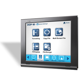 The Delta DOP-W series is available is sizes 10.4", 12.1" and 15", offering high resolution and brightness. Using a Cortex-A8 processor ensures rapid response and high performance. The rugged IP65 aluminium housing, ideal of harsh environments, offers protection against vibration, wide temperature range, dust and water. Other features include built in stereo speakers.