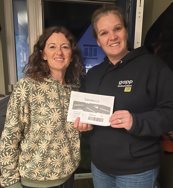 Yvonne Walker (Gapp Automation Ltd Office Manager) presenting Sainsbury Food Voucher to Daniela Bove-Pope (Olney Is Kind Helper/Organiser).